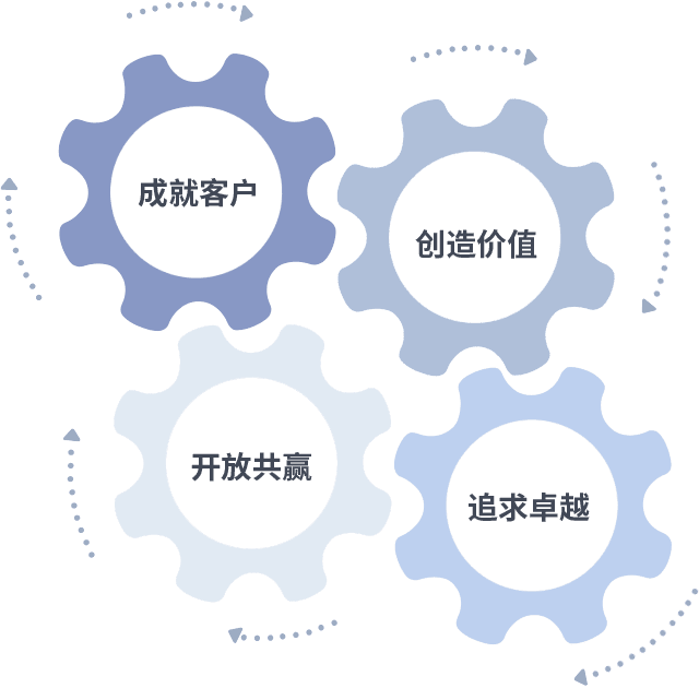 成就客户是一切决策的出发点,,,创造价值是衡量所有工作的标准,,,追求卓越是我们做事做人的态度,,开放共赢是我们的格局也是最终的结果。。价值观的齿轮环环相扣,,,推动着组织里的每个人不断向前。。。