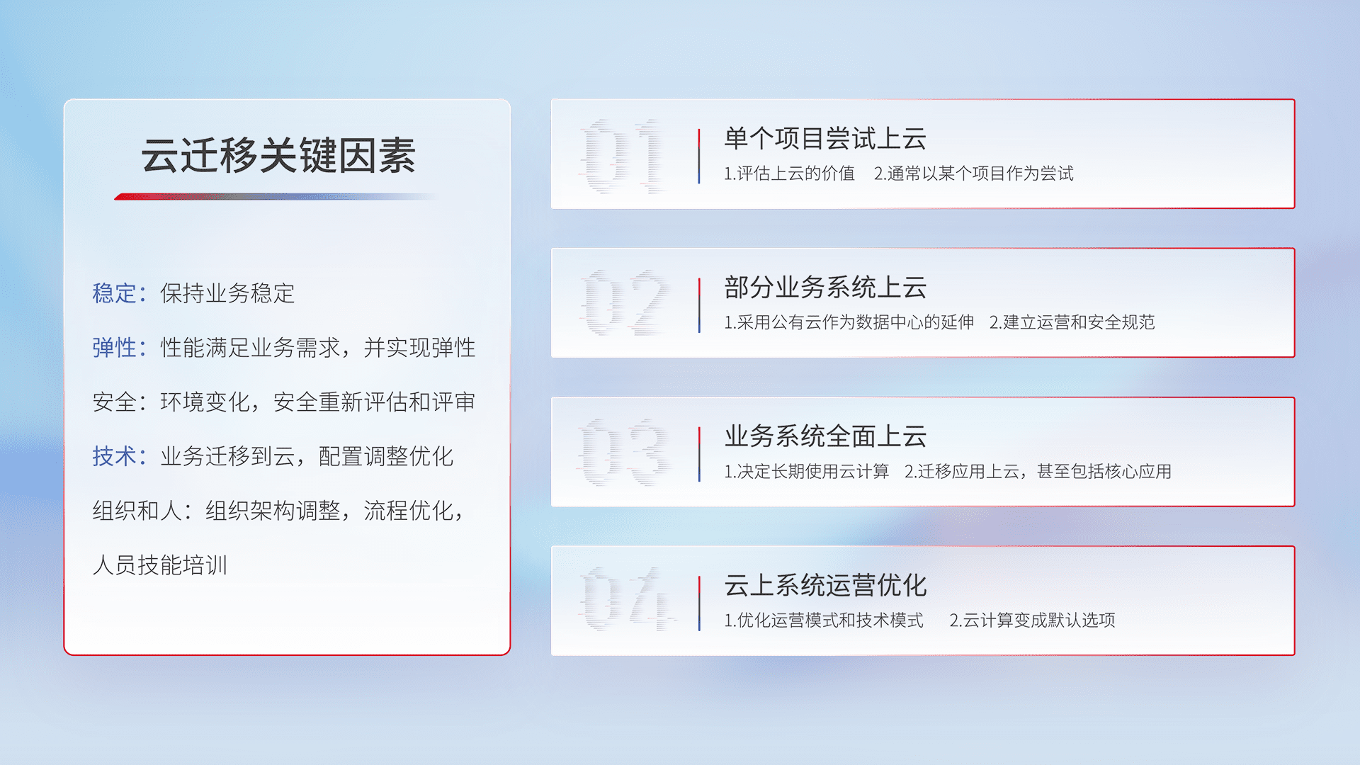 结合实际业务,,,从规划设计、、、云平台选型、、、云原生改造、、、数据迁移、、集成交付,,,迁移全过程为客户识别最佳上云路径,,,,做好风险识别管理,,,,设计网络架构、、身份权限、、安全审计合规、、、操作审计、、日志审计、、、监控告警策略、、多站点容灾设计等,,对云上基础设施进行整体规划,,提升IT治理水平,,,,以满足弹性、、高可用、、高性能的需求。。
