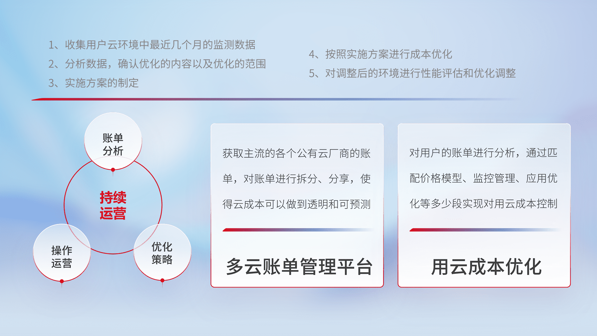 通过多云纳管,,,,以统一的资源数据模型把客户的云资源进行抽象和封装,,,进而实现对多云资源的统一操作,,保障云资源管理的可靠性、、、、稳定性与可用性。。。量身定制化运维内容,,配置、、、开发运维、、、补丁管理、、备份、、、、监控、、认证和访问管理、、、、审计和日常巡检等,,,,保障在用云过程中的可靠度,,,稳定度以及高可用率。。